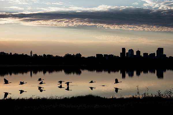 Geese take flight on Sloan's Lake in Denver in the early morning light.